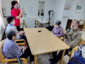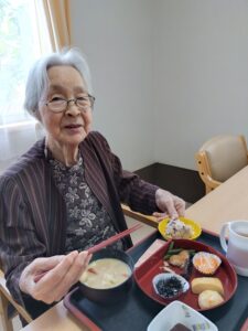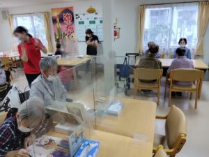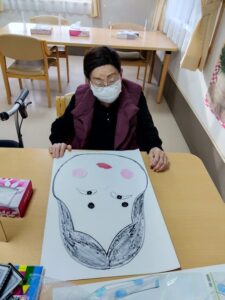 あけましておめでとうございます。 本年もどうぞよろしくお願い致します。 みなさまにおせち料理と赤飯、そしてお雑煮を召し上がっていただきました。昼食後には食堂にてカラオケやぬり絵、福笑いにて遊びました。何年かぶりのカラオケとなったかたもおられました。