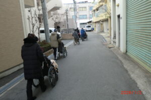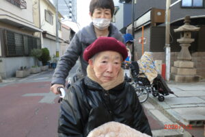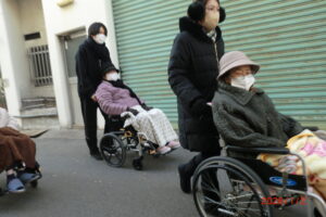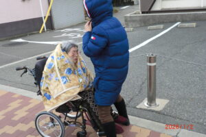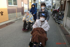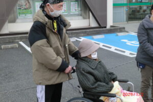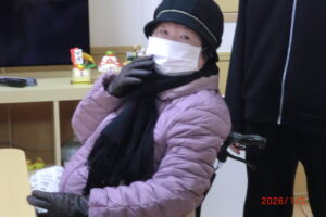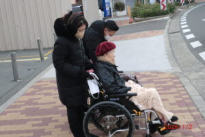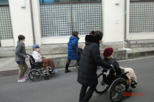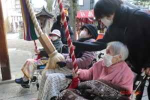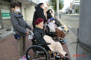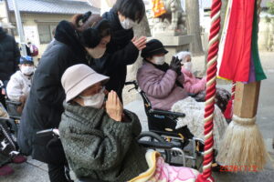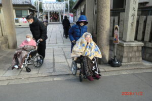 この便では少し寒さが増してきました。何が何でも風邪を貰ってくるわけにはいきませんよ!もう体ををグルグル巻いて、車いすの足元は特に寒いので入念に!そしていつものようにぞろぞろと。もしかして近所の方には恒例の行列になっているかもしれませんね(*^^*)みんなでいっぱいお願いしました。お賽銭は私が代表してみんなの願いが届きますように!