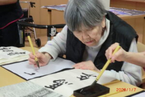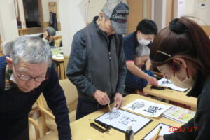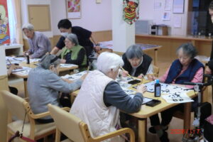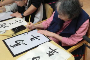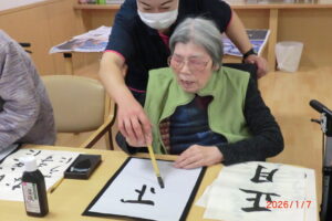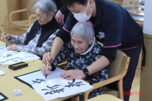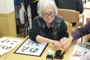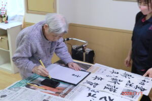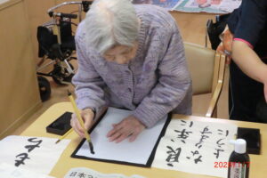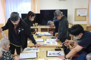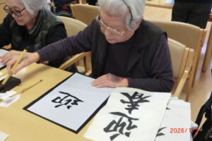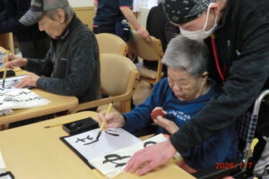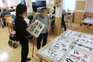 一人が、「立った方が書きやすい」と言うと皆が経って書き始める。1度かくともっと上手く書きたい欲が出てくるもの。そして私の独断と偏見により、一番うまく書けたものを廊下や食堂に飾っています(*^^*)「どれが一番上手いかな」「さっきの方が上手くいった」「四文字は難しい」などなど。みんな好きなことを言いながらも、うまく書きたい気持ちが沸き上がっているようです。今里のレクレーションは自由参加。好きなことに参加してもらい楽しんでいただいておりますよ!